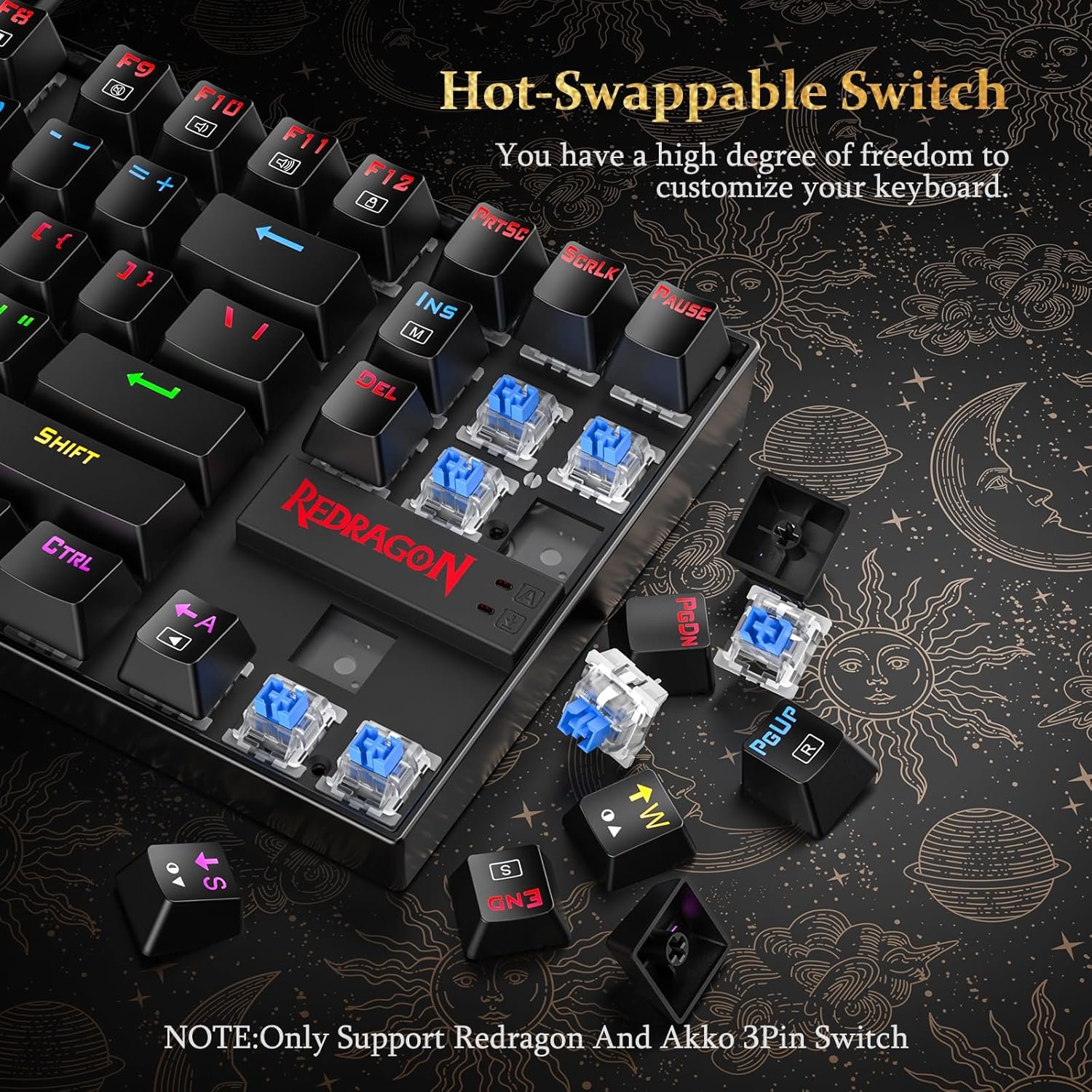 يأتي بمفاتيح Blue Switch (Clicky & Tactile) التي تقدم إحساس ضغط واضح مع صوت “كليك” مسموع، مما يعطيك دقة أعلى وإحساس فعلي بكل ضغطة — مثالي للكتابة والأشخاص اللي يحبوا الإحساس الميكانيكي التقليدي.