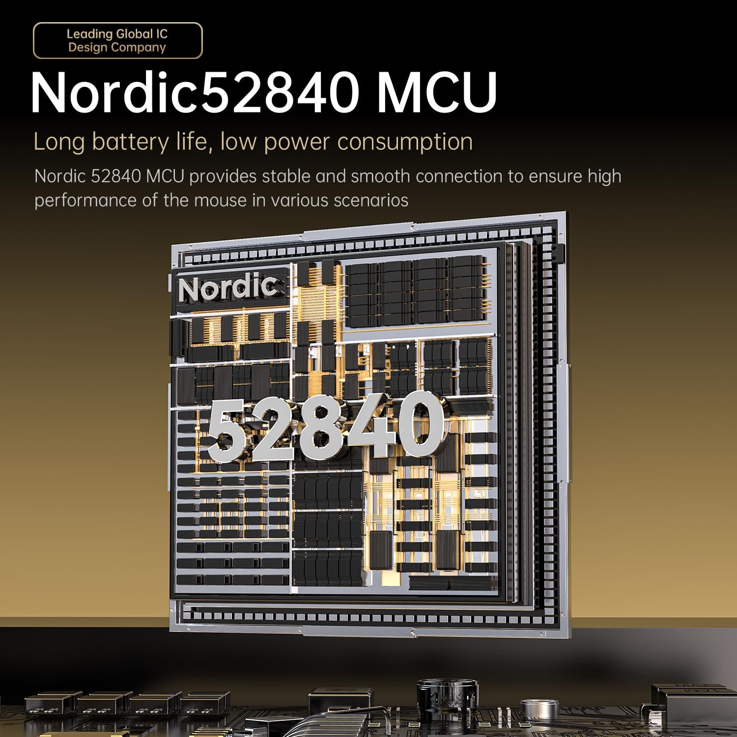مدعوم بشريحة التحكم المتقدمة Nordic 52840 لضمان استهلاك منخفض للطاقة، عمر بطارية طويل، واتصال ثابت جدًا. يمكنك التبديل بسهولة بين 2.4GHz بمعدل استجابة 8K Hz، وبلوتوث، والوضع السلكي بمعدل 1K Hz لتجربة أداء بدون تأخير على PC، Mac، التابلت، والكونسول.