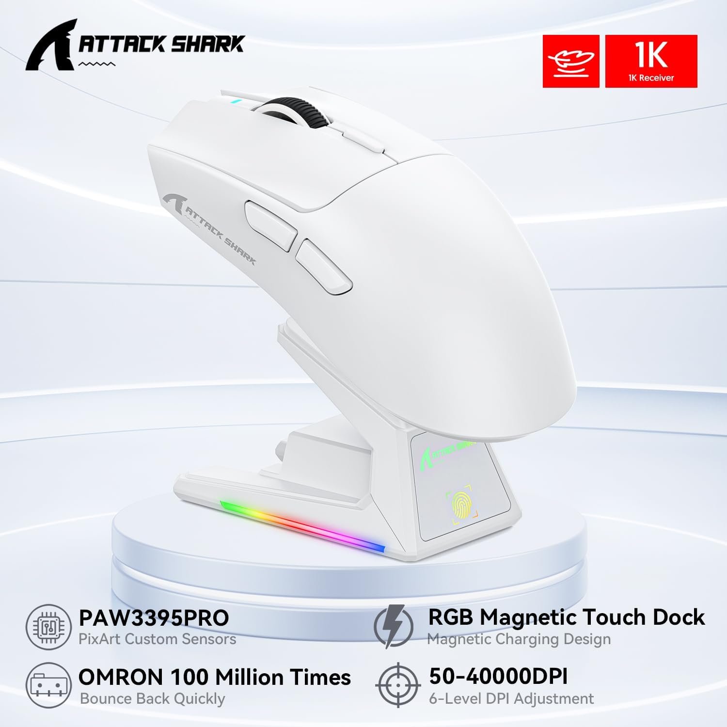 الميزة المميزة في هذا الماوس هي قاعدة الشحن المغناطيسية المزوّدة بلوحة لمس (Touchpad)، اللي تتيح لك تغيير أنماط الإضاءة RGB بسهولة والشحن بدون أسلاك.