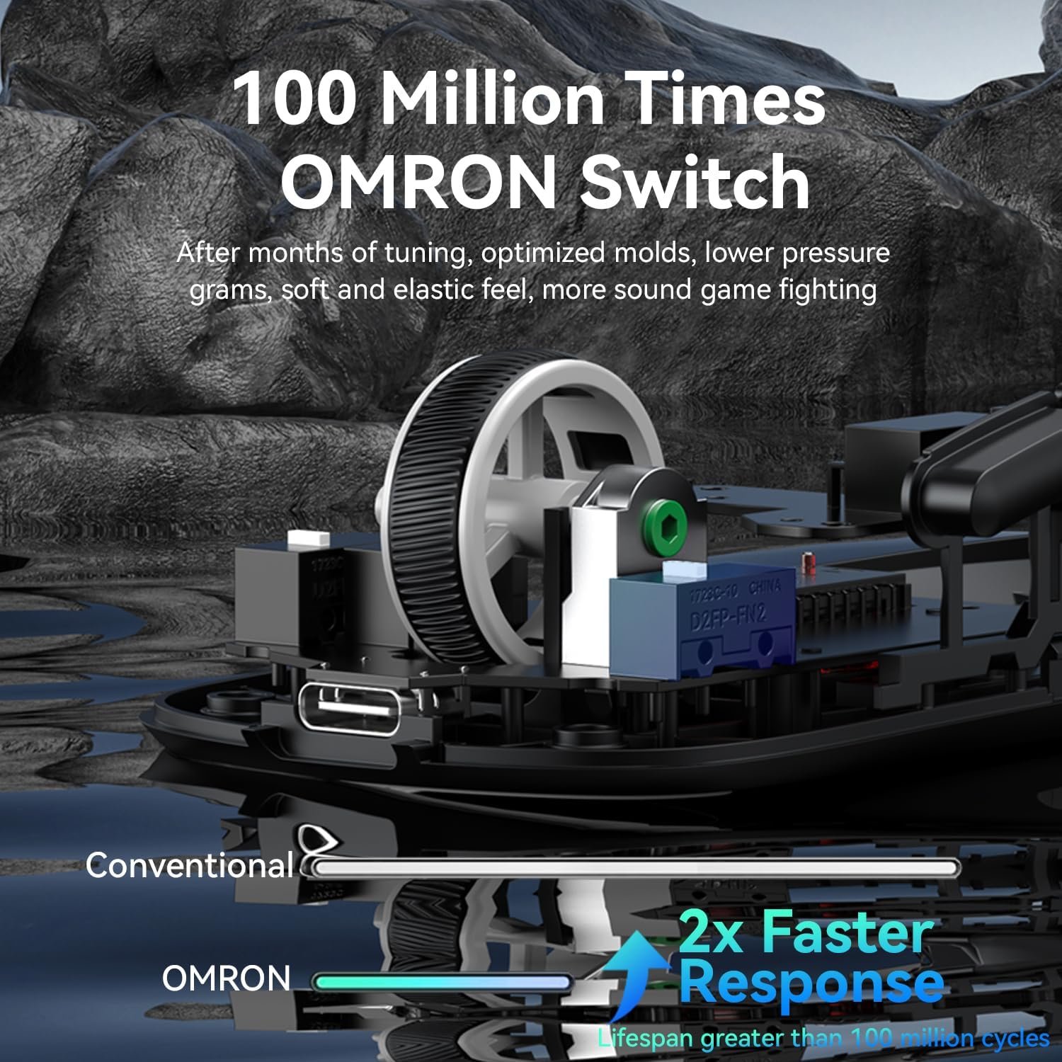 تصميمه خفيف جدًا بوزن حوالي 53 جرام فقط لتحركات سريعة وسلسة أثناء اللعب، مع مفاتيح Omron تتحمل أكثر من 100 مليون نقرة لضمان متانة عالية.