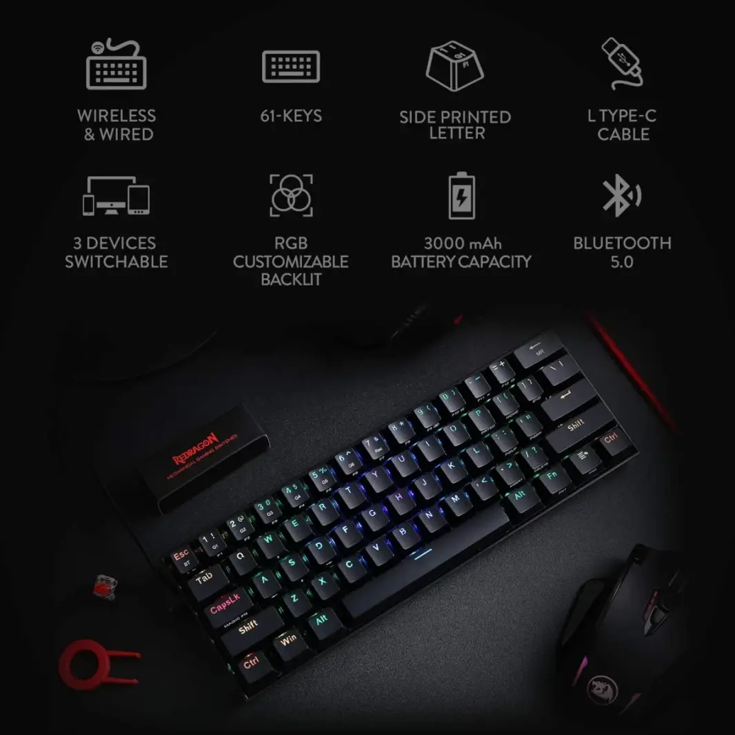 كيبورد Redragon K530 Pro Draconic هو كيبورد ميكانيكي مدمج بحجم 60% (61 زر) مصمم للاعبين اللي بدهم مساحة أكبر على المكتب وأداء عالي. تصميمه الصغير يعطيك حرية حركة أكبر للماوس، خصوصًا في ألعاب الـ FPS.