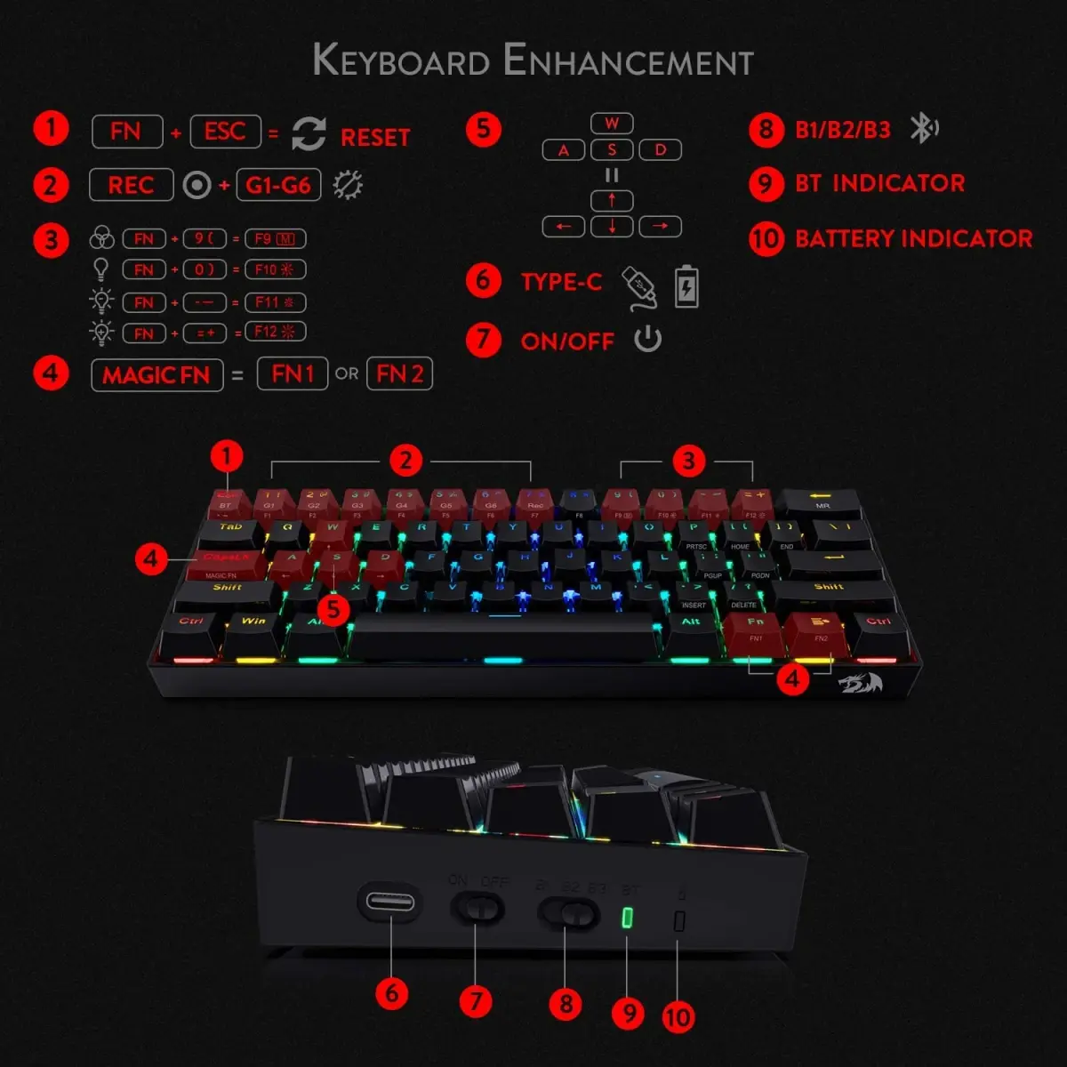 يأتي مزودًا بمفاتيح Red Switch قابلة للتبديل (Hot-Swappable)، والتي توفر ضغطات ناعمة، سريعة وهادئة بدون صوت مزعج أو مقاومة، مما يجعله مثاليًا للألعاب السريعة والاستخدام الطويل.