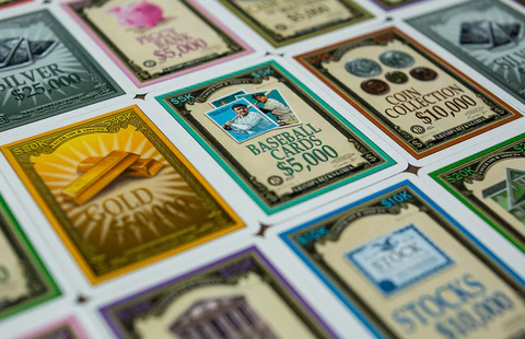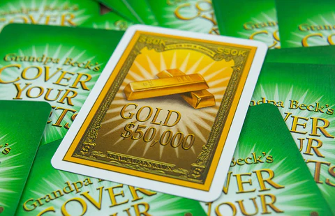 The top set of assets in your pile is vulnerable, and can be stolen by other players if they show you a matching asset card, or wild (which are Silver and Gold cards) from their hand. You can defend your stack by showing the challenger a matching card from your own hand. If you do, they can counter with another matching card of their own. The battle rages back and forth until one player can’t respond, or bows out.