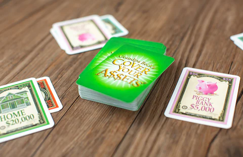 In Cover Your Assets, players compete to become the first millionaire by building towers of matching sets made from 10 different types of asset cards (things like jewels, piggy banks, classic autos, and more). Each new set that is created is stacked crosswise on top of the previous set, covering, and protecting, all the sets beneath it.