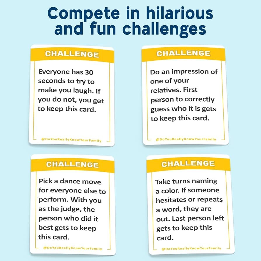 Get ready to compete against your family to see who really knows each other best. Learn about each other and build new family memories as you answer interesting questions, spark conversations and perform silly challenges together. This card game will surely become a family game night favorite!