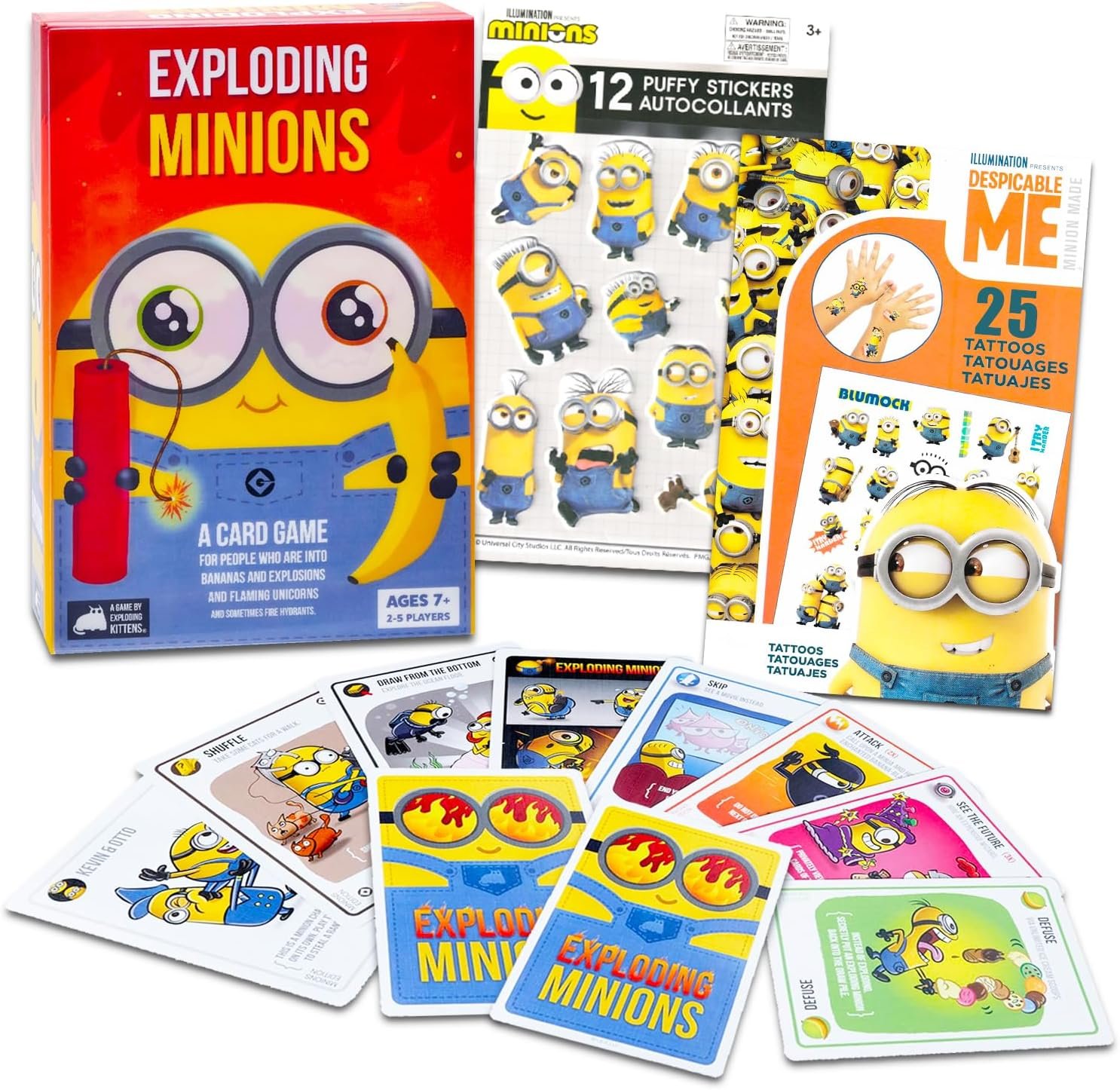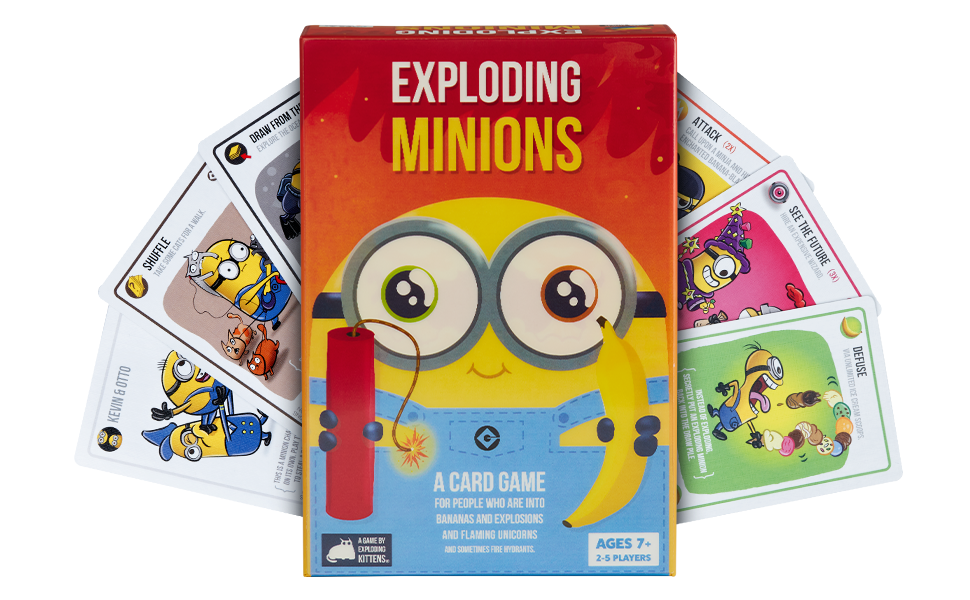 Exploding Minions is a Minions-powered version of Russian Roulette. Players take turns drawing cards until someone draws an Exploding Minion and loses the game. The deck is made up of cards that let you avoid exploding by peeking at cards before you draw, forcing your opponent to draw multiple cards, or shuffling the deck.