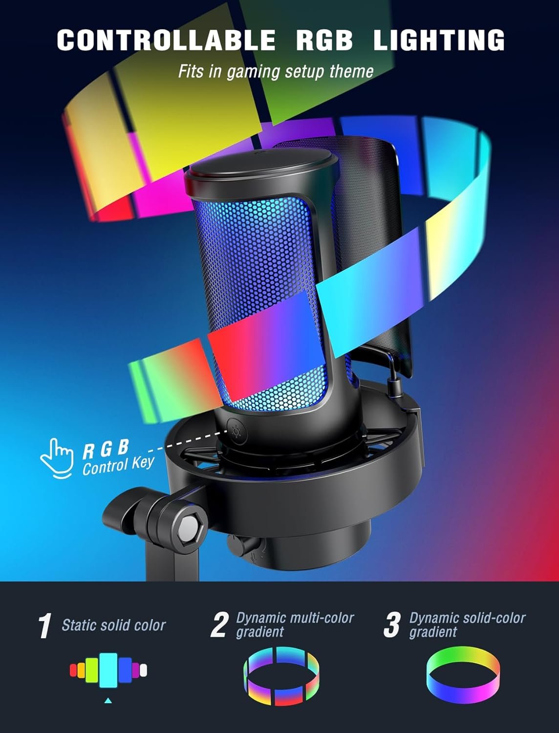 It includes creator-friendly controls such as a tap-to-mute button, gain adjustment knob, headphone monitoring jack, and customizable RGB lighting modes for a professional gaming look.