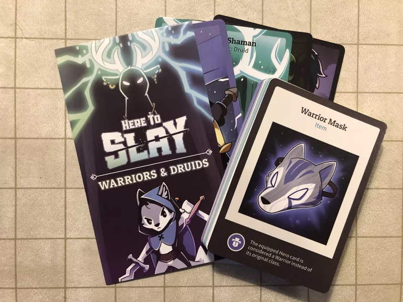 Warrior and Druid classes join the fray in this Here to Slay expansion. This expansion introduces new party leaders, heroes, and dangerous monsters! The Warrior class is headed by The Piercing Howl, a wolf that grants +1 to your roll for each item equipped to a Hero card in your Party. The Druid class, on the other hand, is headed by The Noble Shaman, a stag that allows you to channel the powers of the forest to deduct any player’s roll by 1 once during each player’s turn.