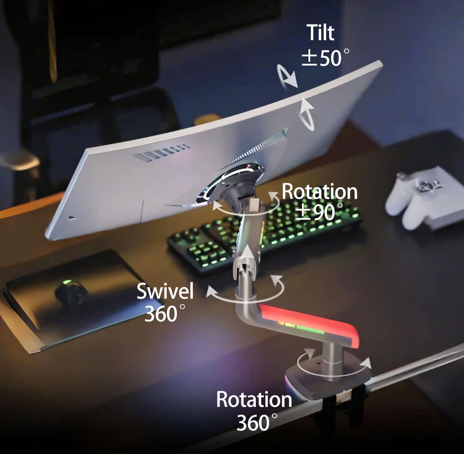 Enjoy full-motion flexibility with 360° rotation, ±50° tilt, and ±90° swivel, giving you complete control over your screen positioning.